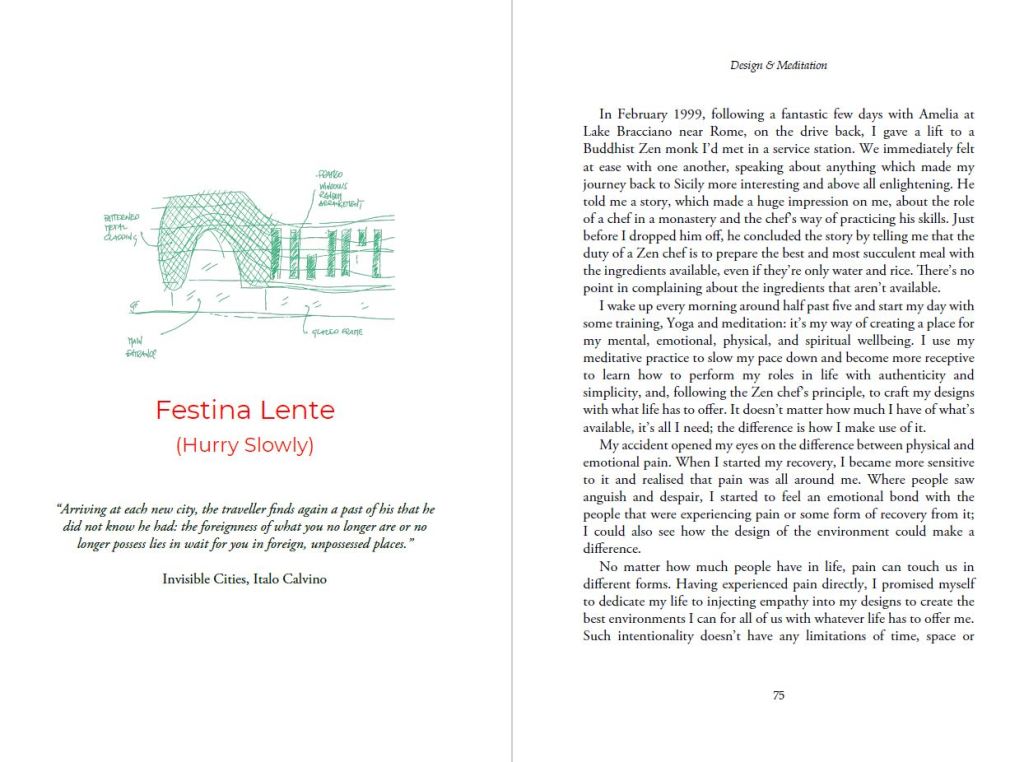 Design & Meditation recounts a deeply personal and empathetic journey towards discovering a space to savour the joys of life and nurture the essence of wellbeing. Alessandro Caruso’s odyssey is a meditative voyage, rooted in the resilience cultivated through the principles of yoga and Eastern philosophies. Along his path, the author emerged as the guiding force of a devoted team dedicated to enriching lives through subtle yet profound methods. This is his story.