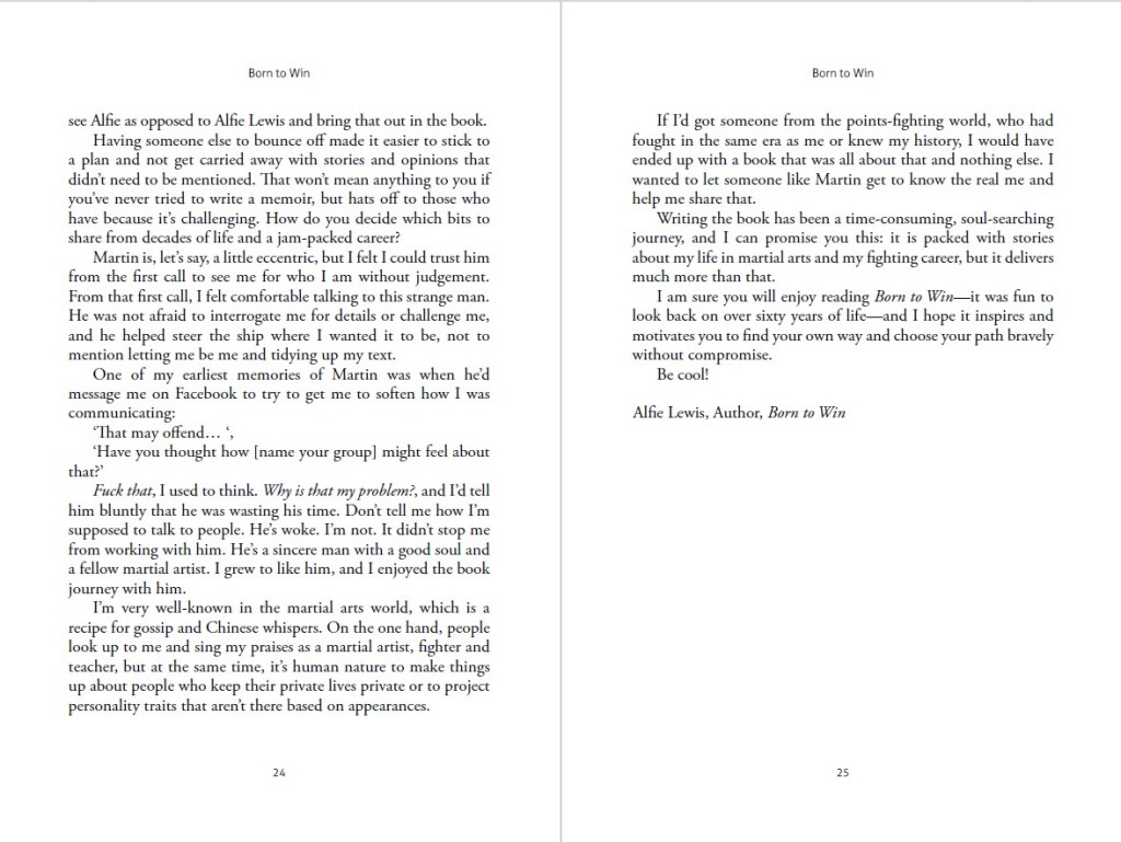 In Born to Win, Alfie shares a frank account of his life, from learning about violence, fear and control as a child to his passion for combat sports. His experiences outside of the martial arts are as exciting as his performance on the points-fighting mats. Alfie’s story genuinely fits the bill as being one you couldn’t make up, and his autobiography could easily be turned into a movie.