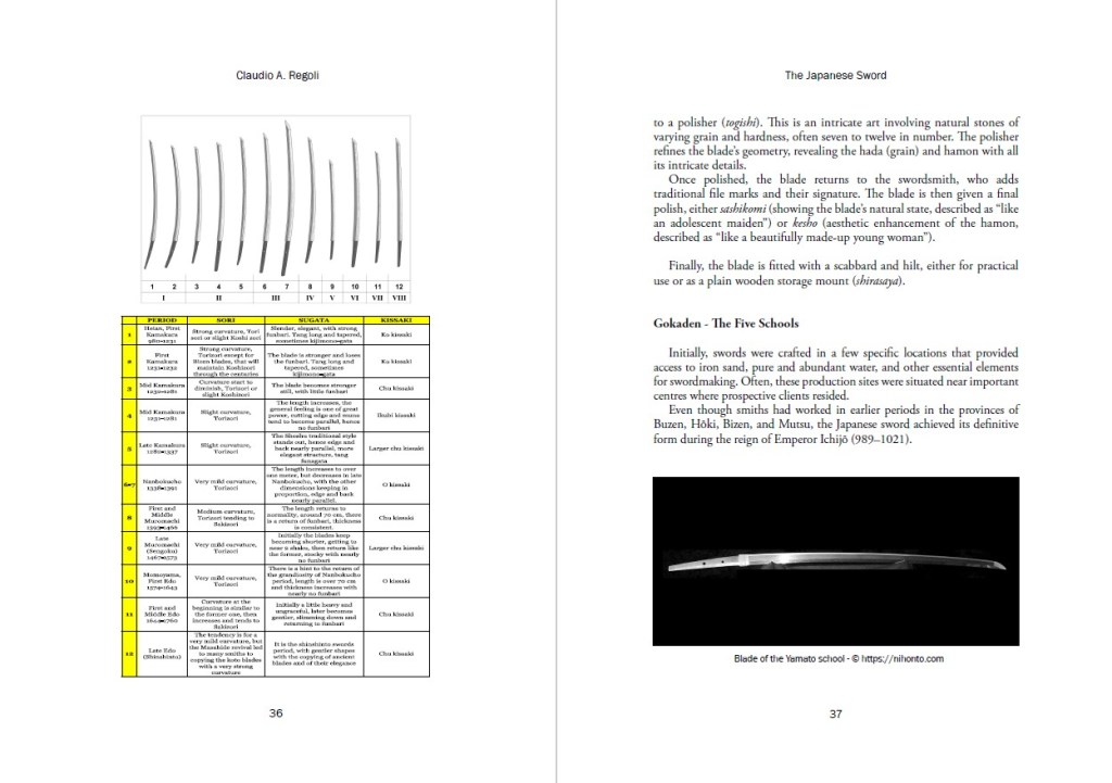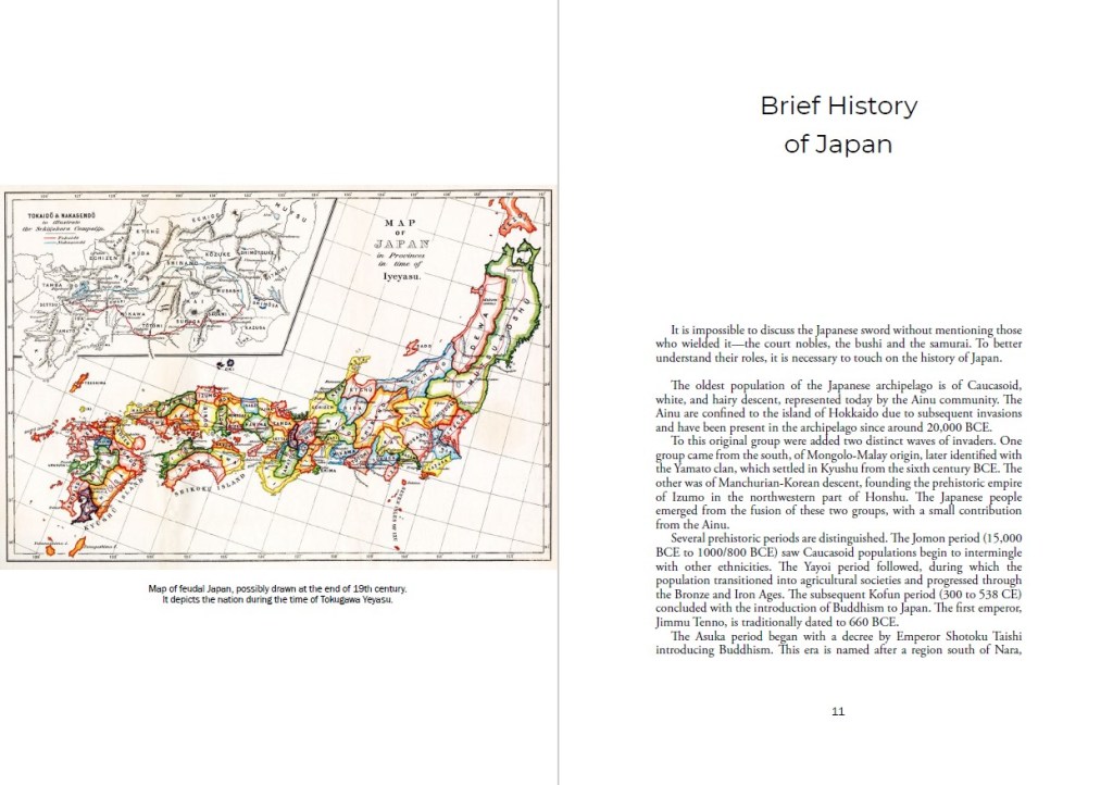 The text offers a concise introductory overview of Japanese history, essential for understanding the origins and development of the Nihontō, the Japanese sword, before moving on to discuss the myths surrounding its emergence. It then focuses on the history of the sword and its manufacture in Japan, delving further into the characteristics that distinguish the various schools of blade production, their respective swordsmiths, specific production methods, polishing, mounting, and blade testing. Considerable space is also devoted to the technical description of the sword and its constituent elements.