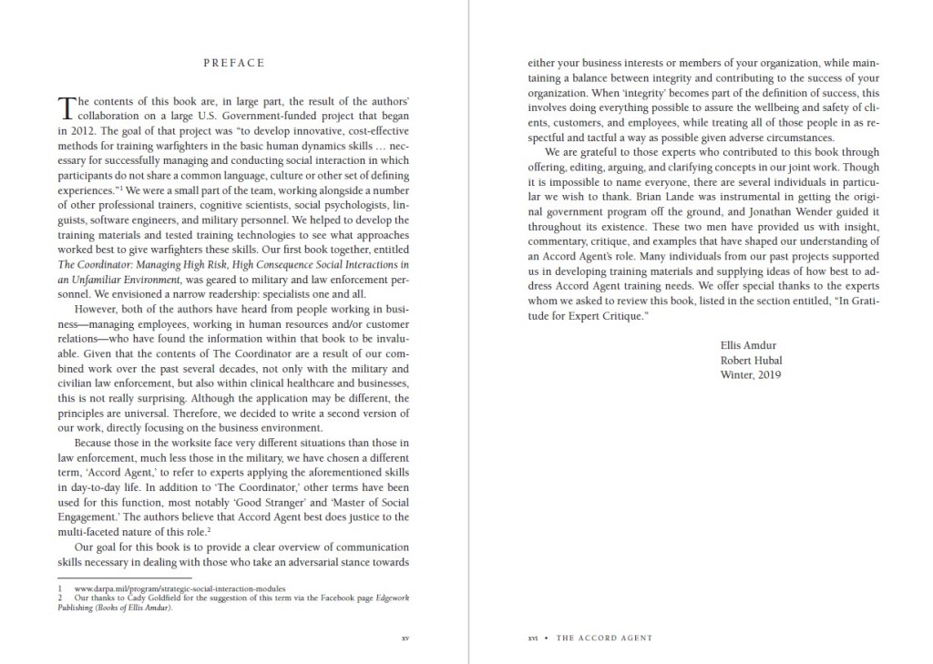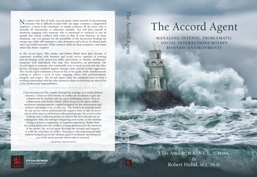 In The Accord Agent, Ellis Amdur and Robert Hubal share their decades of experience working with business and social service agencies in training and developing social interaction skills, particularly in ‘intense, problematic’ situations with individuals who may view themselves as adversarial. The Accord Agent is someone who continually tries to reach accord with the other person, striving to establish rapport, manage crises, and de-escalate aggression.