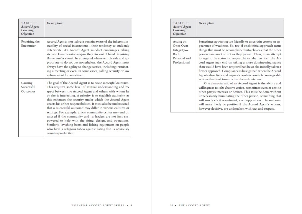 becoming drawn into the conflict or being dominated by the emotions of the parties, the ‘accord agent’ develops the strength and integrity to walk the centerline of conflict, listening to and respecting all sides without losing focus on the ultimate goal of resolution, becoming the eye of the storm around which order is restored.