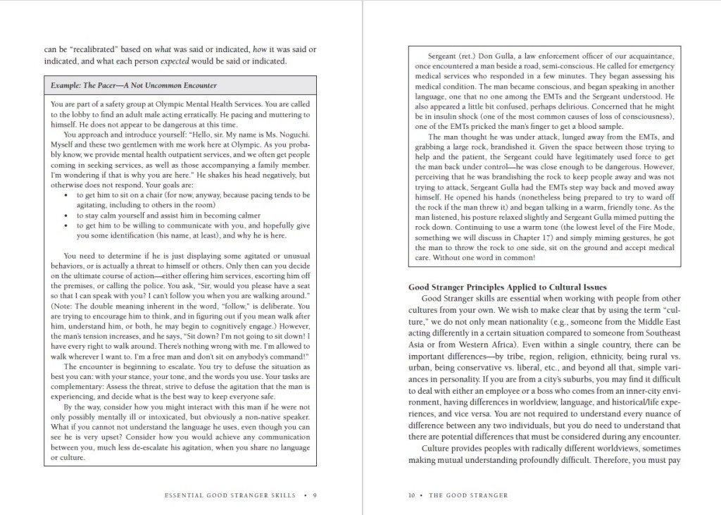 In The Good Stranger, Ellis Amdur and Robert Hubal share their extensive experience working with social service agencies to train and develop essential social interaction skills for handling intense, problematic situations. They emphasize the importance of establishing rapport, managing crises, and de-escalating aggression. The Good Stranger is someone who strives to reach accord with others, while maintaining focus on their goals, building trust and engaging others with professionalism, integrity, and respect.